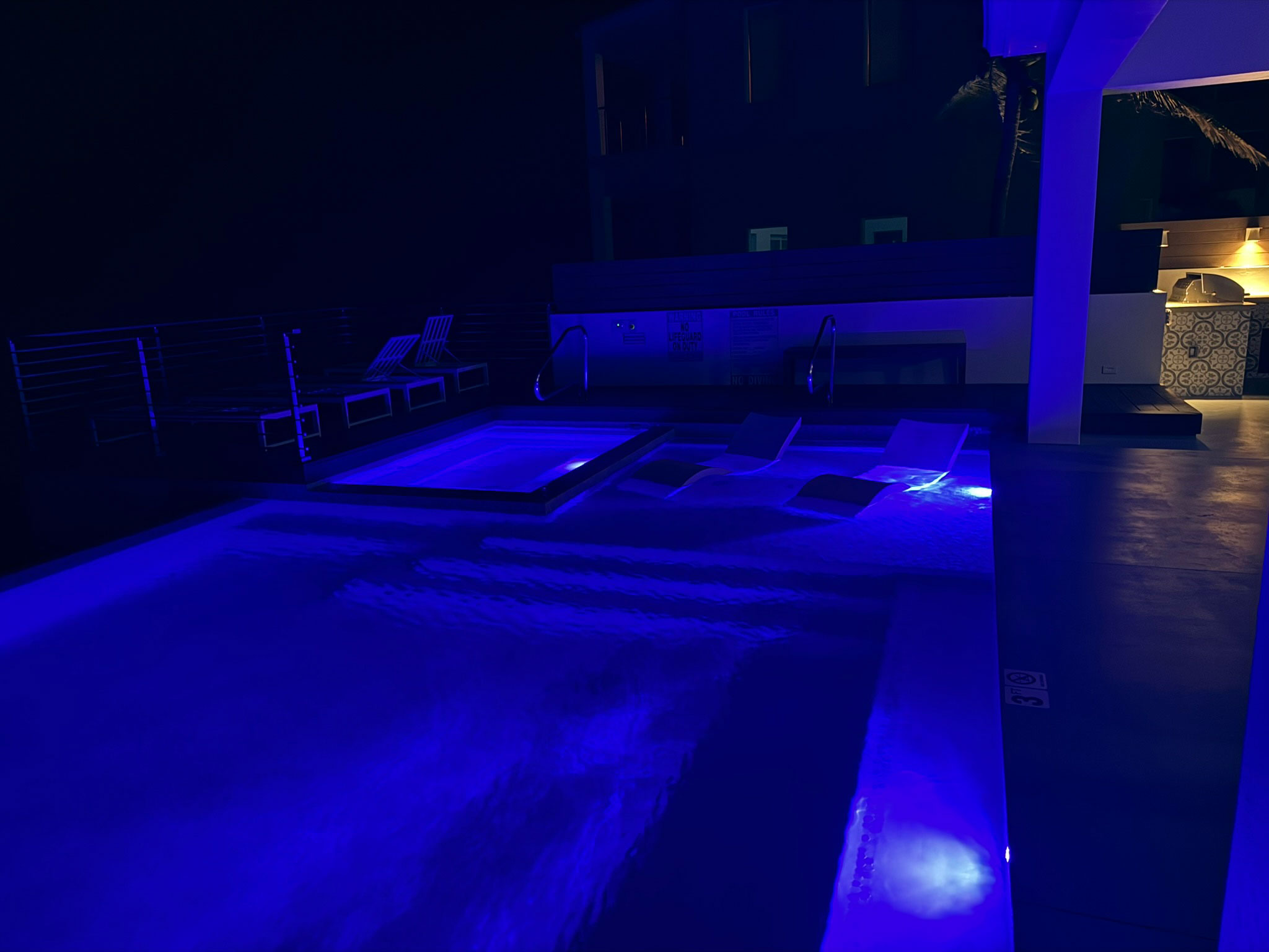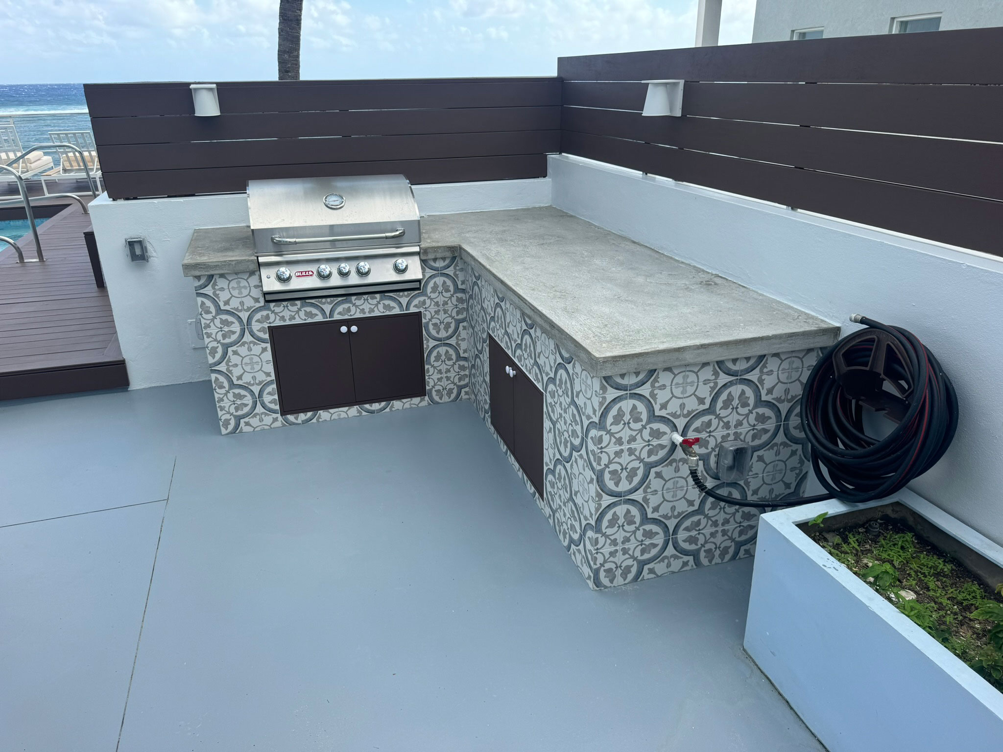 This stunning renovation in Cayman Kai proves that experience makes for smarter design. Once a weathered backyard favorite, this pool and patio were completely transformed with modern materials, a new BBQ and shower area, and vibrant LED lighting.
