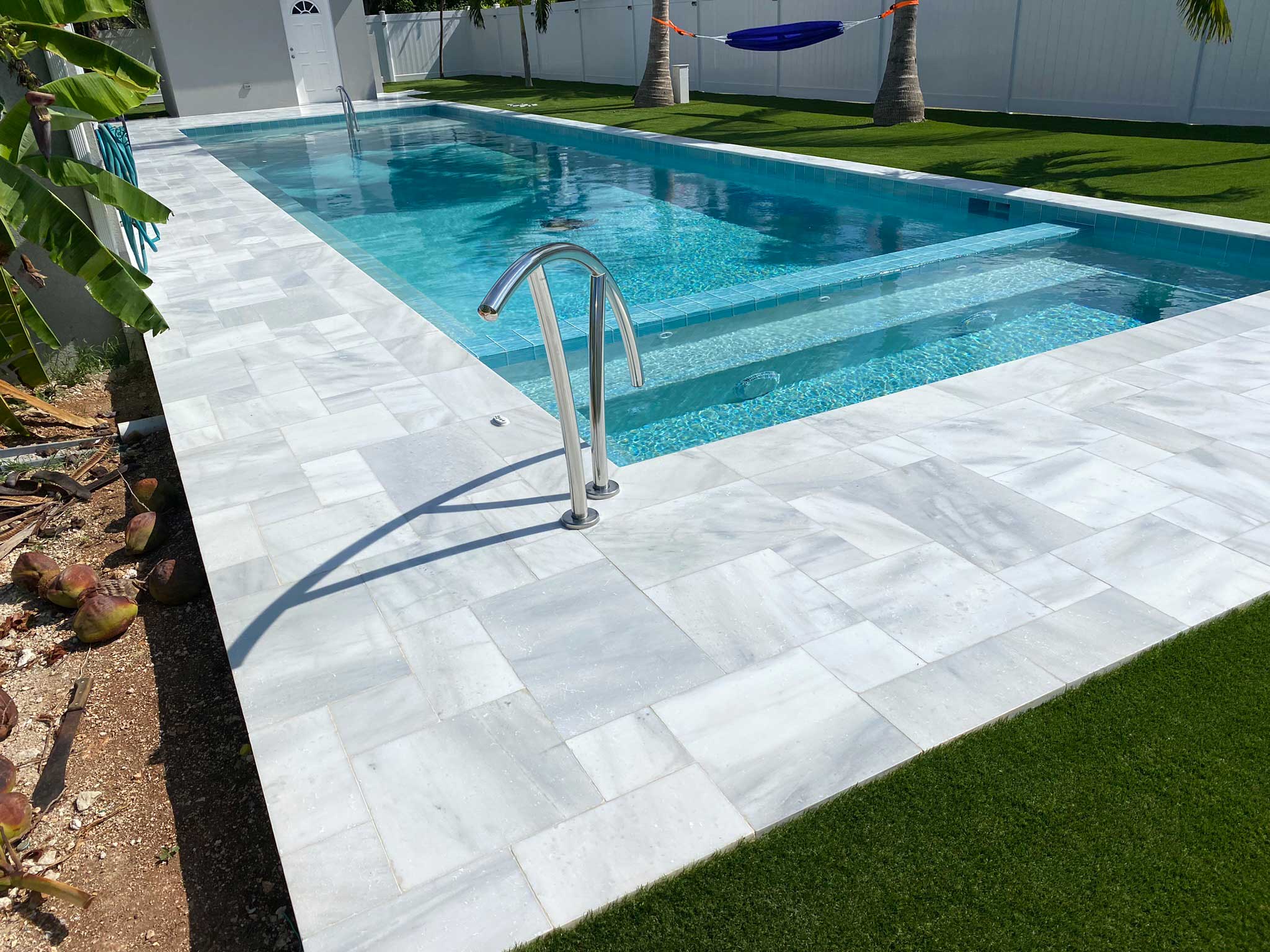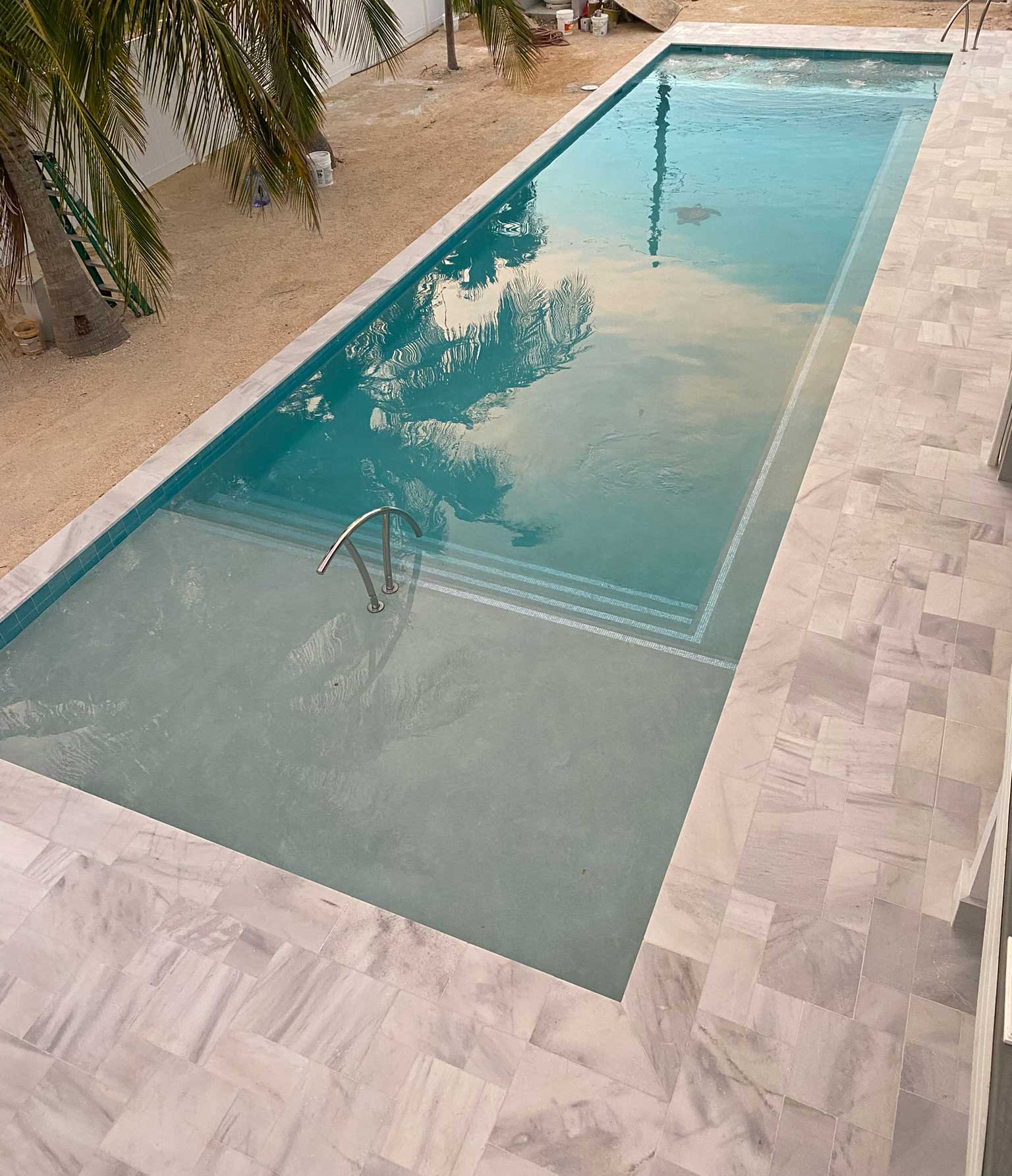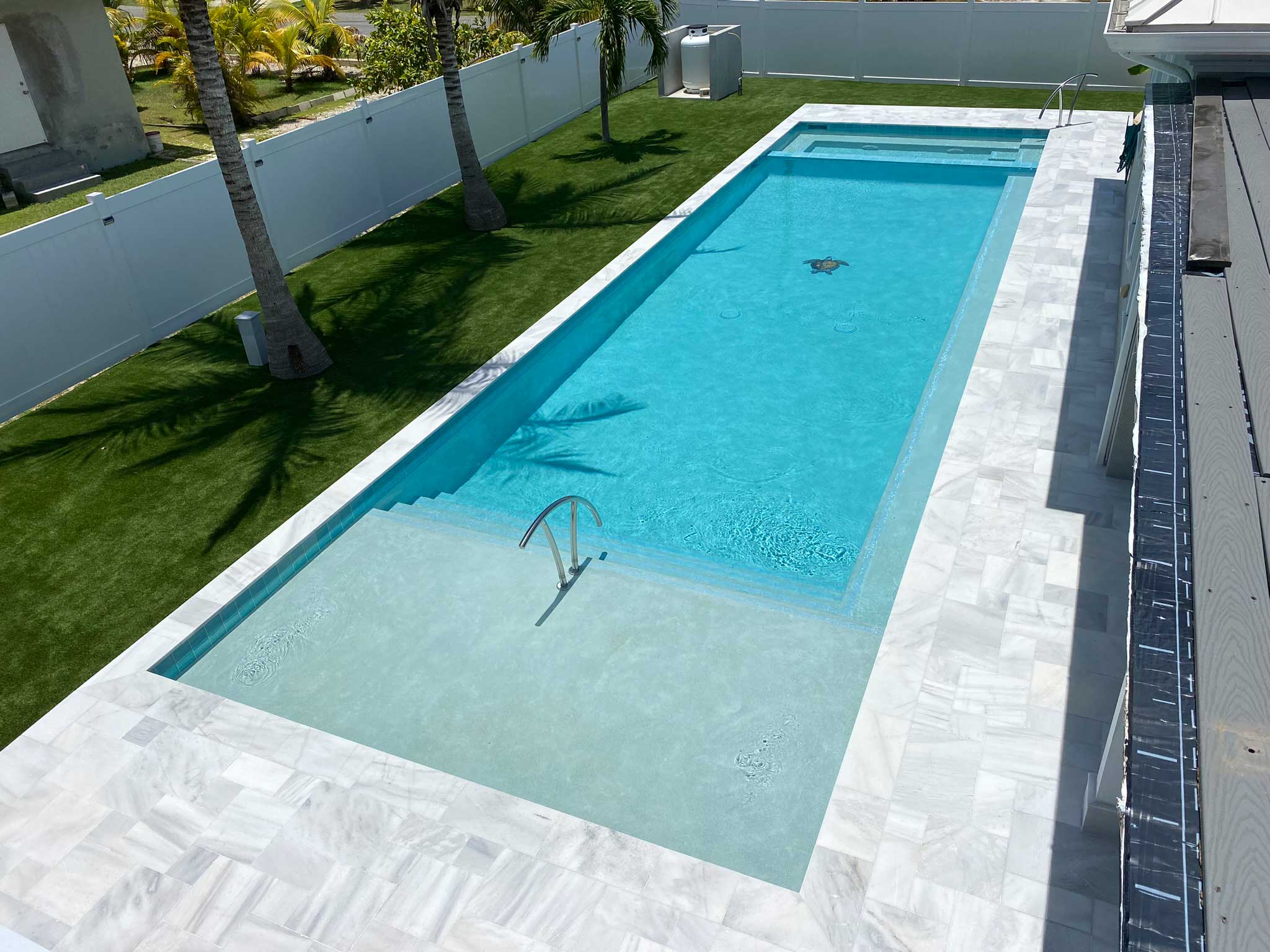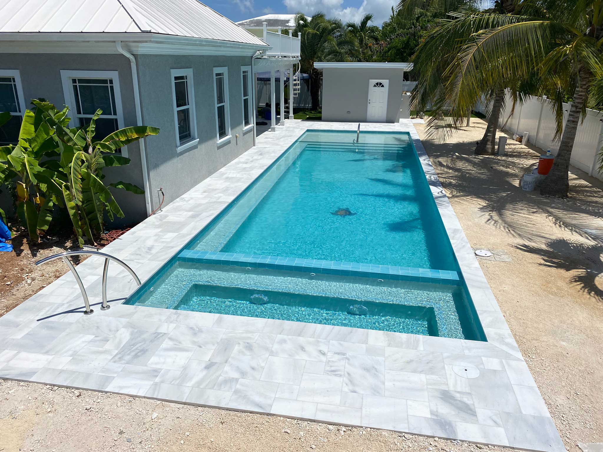This exceptional backyard pool design maximizes space while integrating seamlessly with the surrounding outdoor area. The pool's elongated shape offers ample space for both swimming and relaxation, with a generously sized jacuzzi providing a perfect retreat for unwinding. The light blue color of the pool mirrors the serene shallows of Cayman’s renowned Stingray City, creating a refreshing and inviting atmosphere. A charming custom turtle decoration sits gracefully at the pool's center, adding a playful yet sophisticated touch. The design extends the indoor elegance to the outdoor space, using consistent materials to blend the pool area with the home's interior seamlessly. The result is a crystal-clear, stunning pool that enhances the backyard with a tranquil oasis, complemented by space for palm trees and hammocks to complete the ultimate Cayman island experience.
