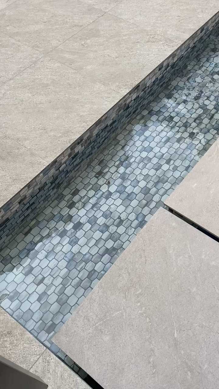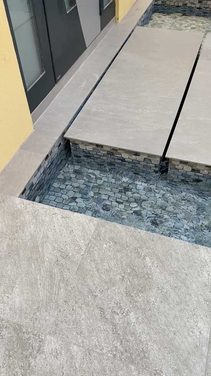 This project showcases the creative possibilities when you entrust water-related home decor to a pool construction expert. The entrance features a sophisticated mini pool with a tranquil waterfall, designed to captivate from the moment you arrive. The pathway to the home is crafted with individual island steps, each meticulously placed to create the illusion of walking on water. The subtle circulation of water between these sleek, rectangular tiles adds a dynamic yet serene touch. This elegant design not only elevates the entrance but also highlights the power of thoughtful, water-inspired decor to make a lasting impression.