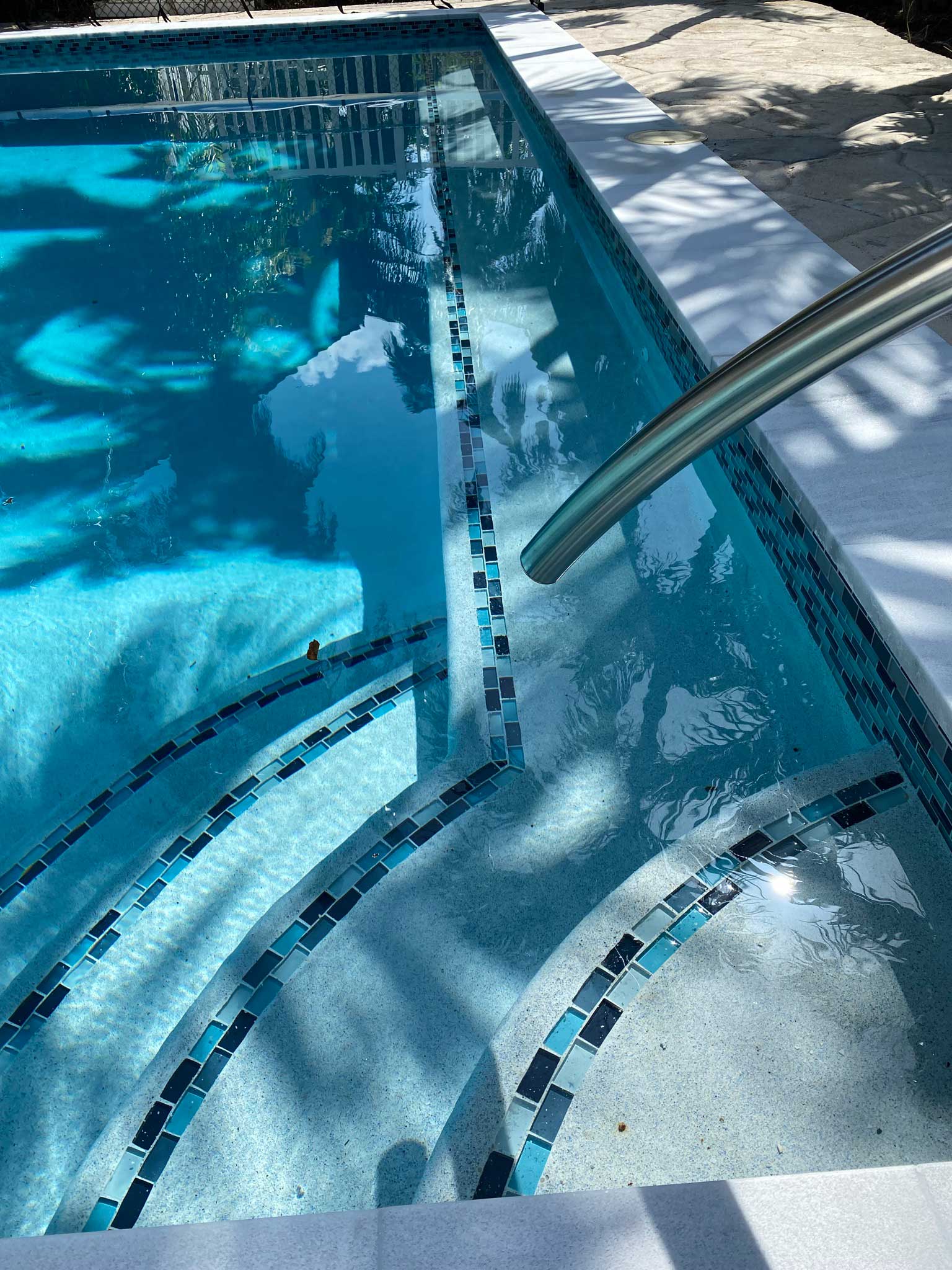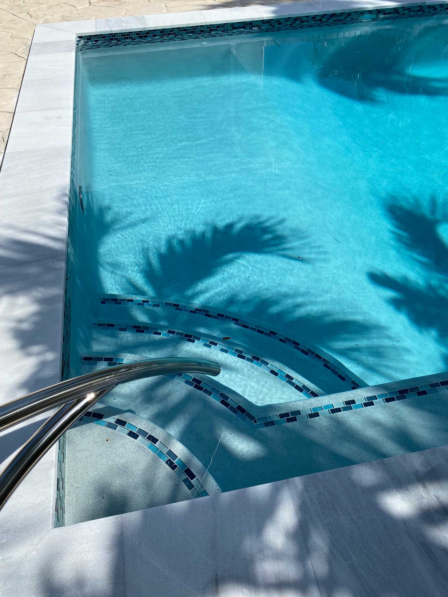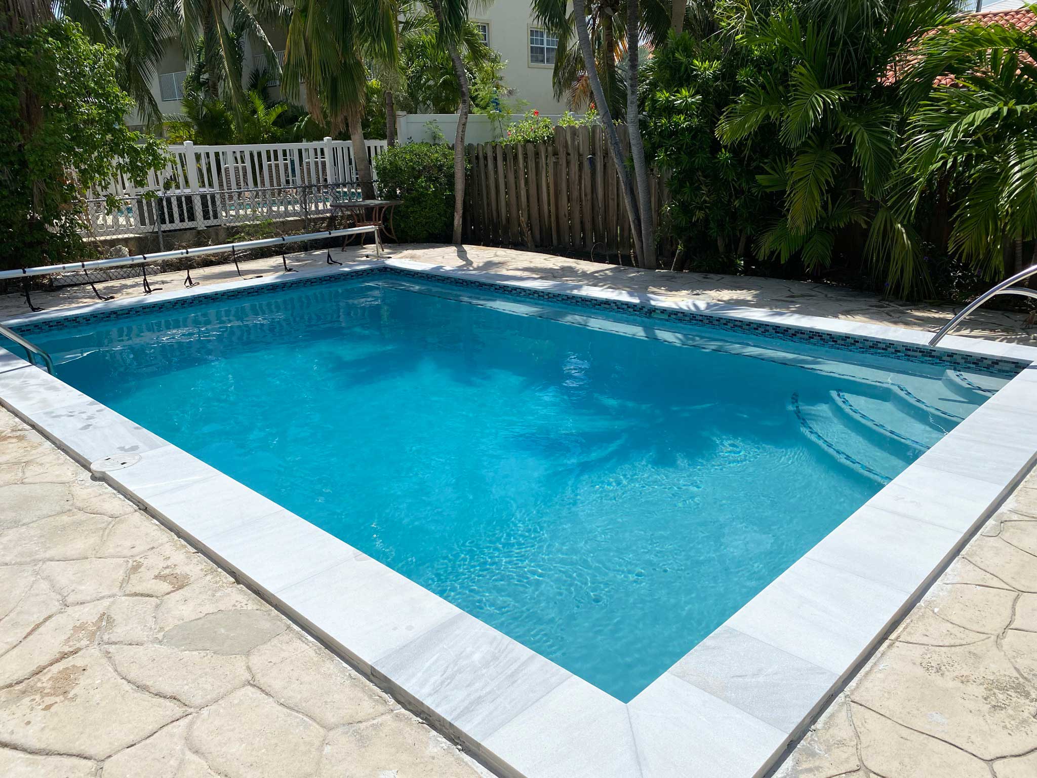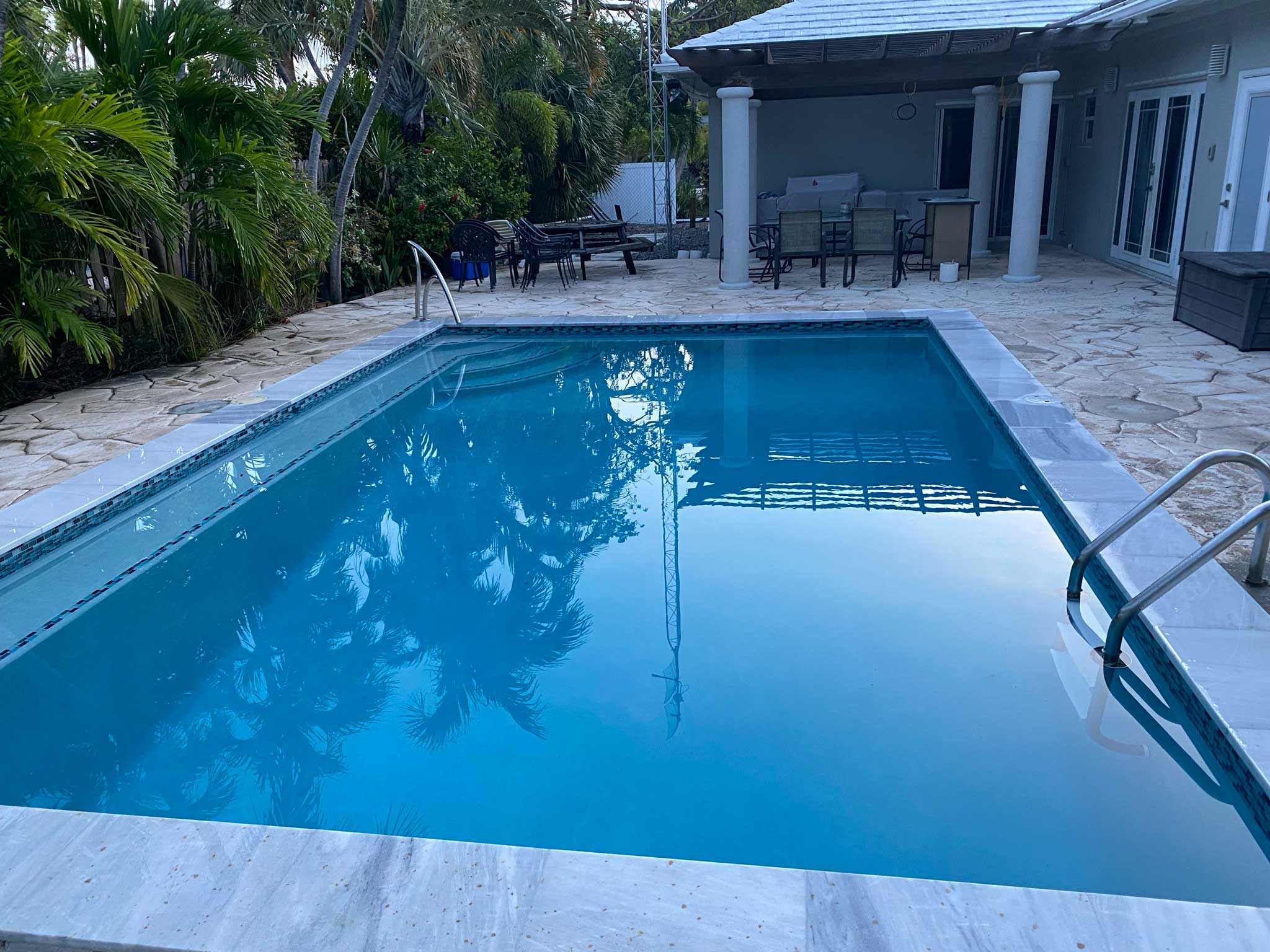 All colors and materials have been updated to reflect the latest trends, bringing a fresh, contemporary feel to the space. The outdated plumbing system was entirely replaced with a new, energy-efficient setup, ensuring the pool not only looks stunning but also operates smoothly and cost-effectively. The result is a rejuvenated pool that blends the old with the new, offering a beautiful and functional backyard retreat.